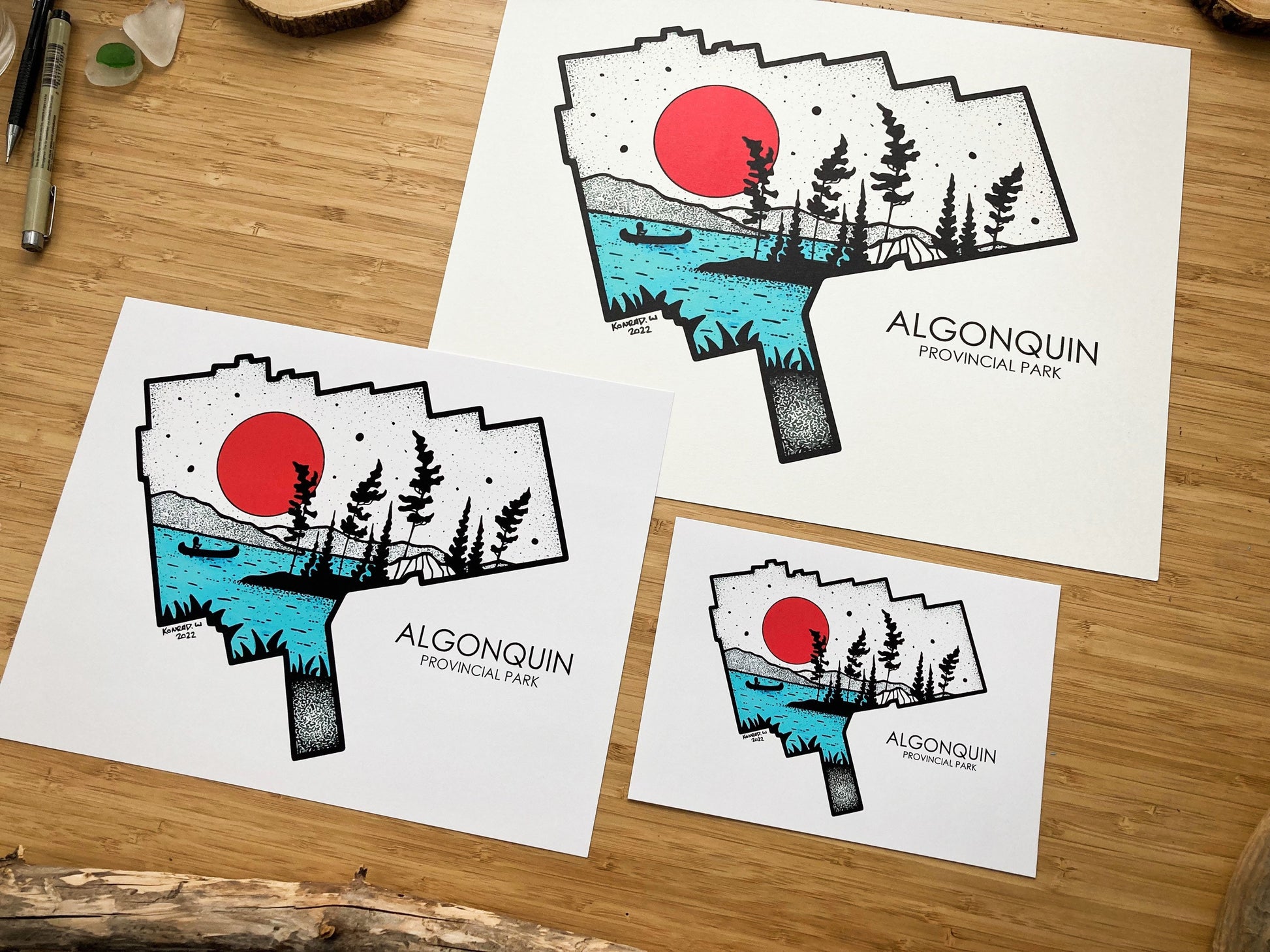 The design of these prints was created by hand using archival ink pens. Using various stippling and shading techniques, the ink gives this piece a more modern or bold design that goes well will virtually any decor style. These prints come in three different sizes offering you options that fit a multiple of different spaces, from your home, office, cottage or even your van!