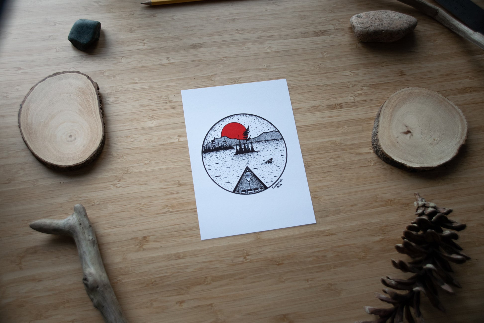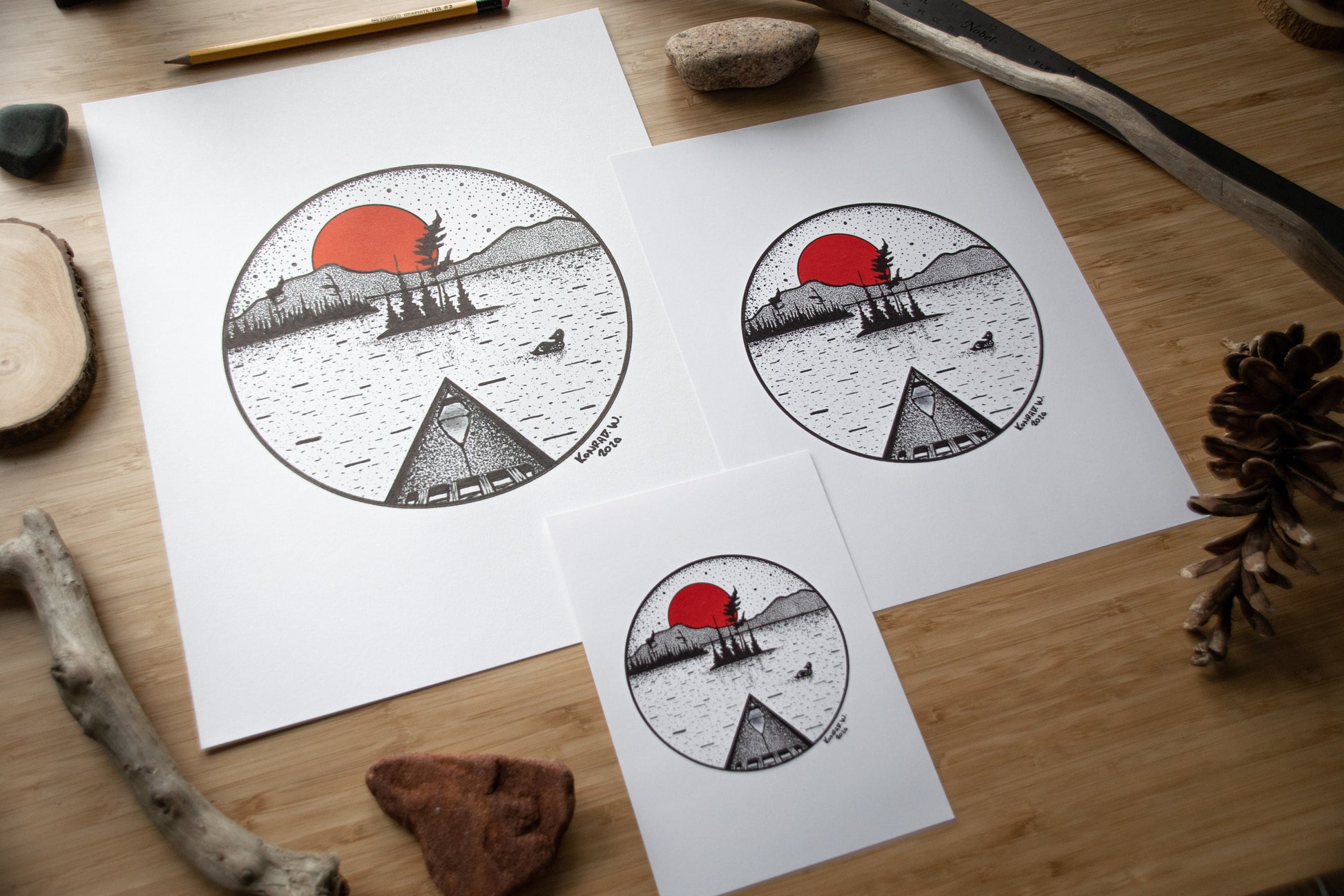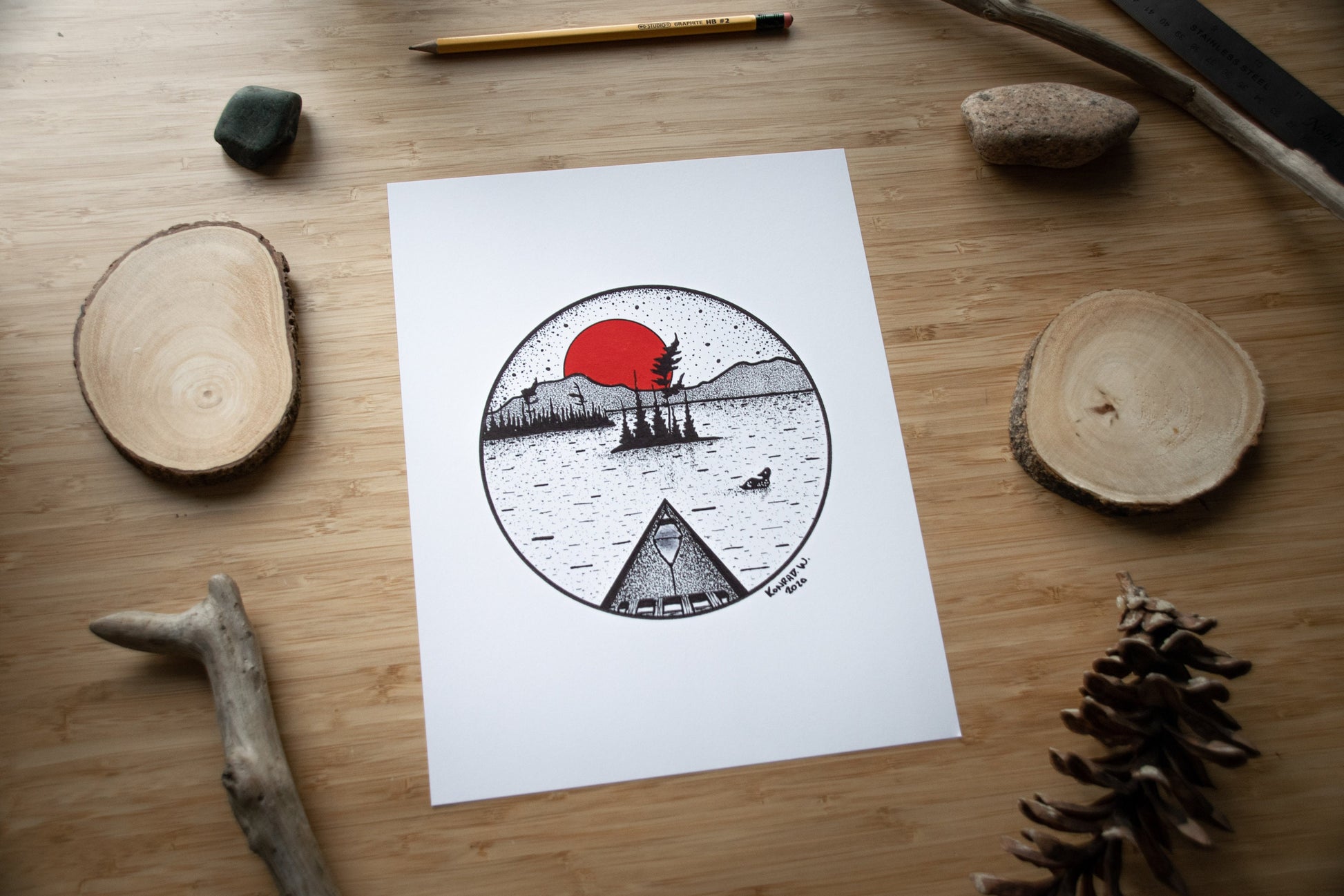 This Pen and Ink Print features a Northern Ontario inspired landscape with a canoe in the foreground, perfect for anyone who loves paddling.