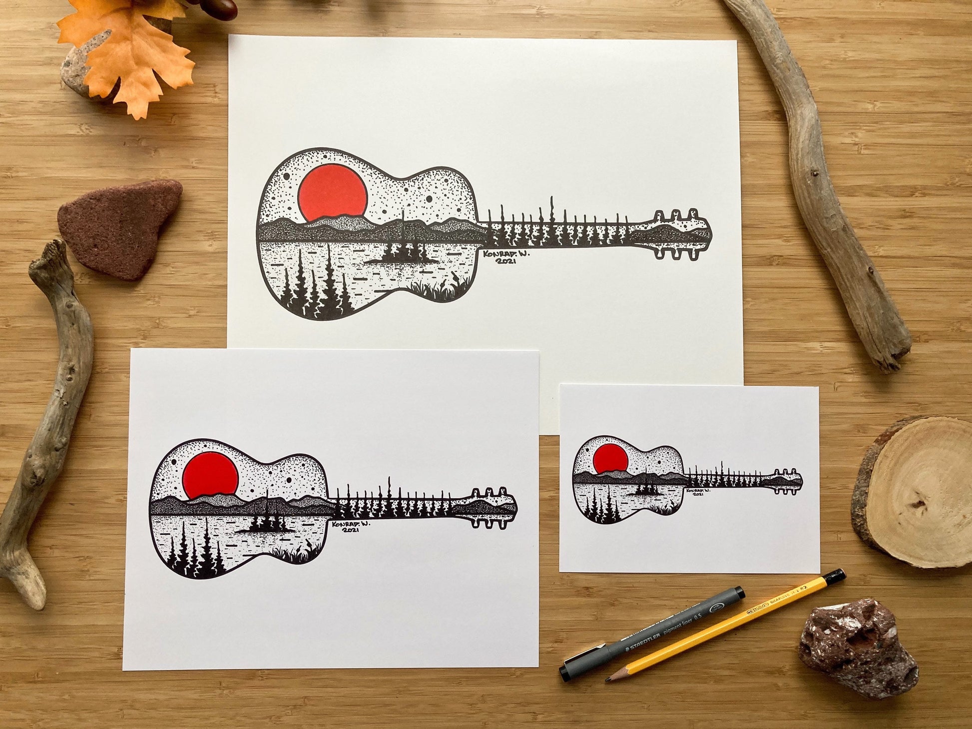 Strumming an acoustic guitar is one of the greatest joys for many people. This Guitar Silhouette Pen and Ink Print is perfect for those who find harmony in music and nature.