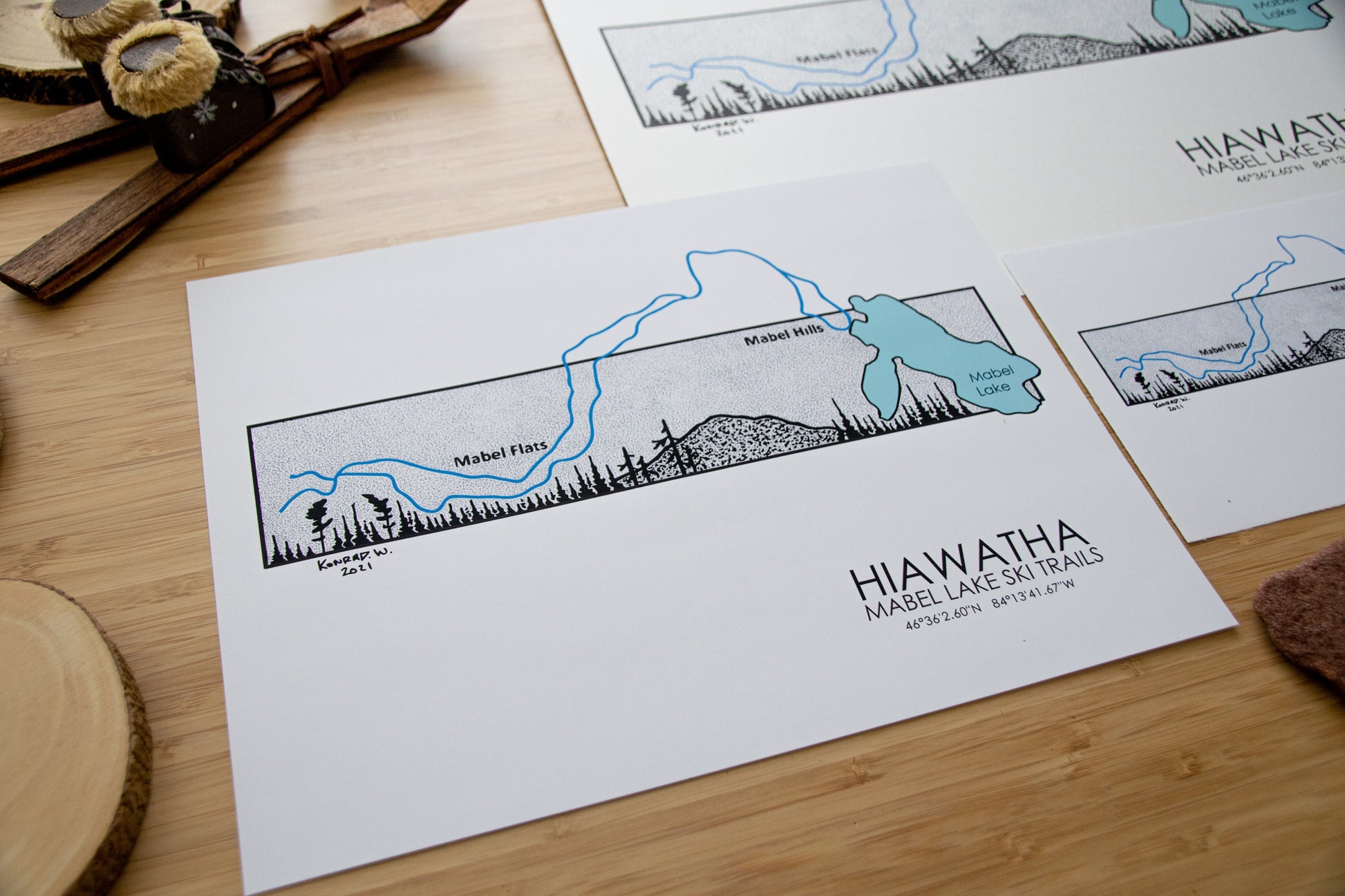 Introducing the Hiawatha Mabel Lake Ski Trail Map Pen and Ink Prints! These prints are perfect for those who love cross country skiing in Sault Ste. Marie's very own Hiawatha Highlands, making a great keepsake for the home or office.