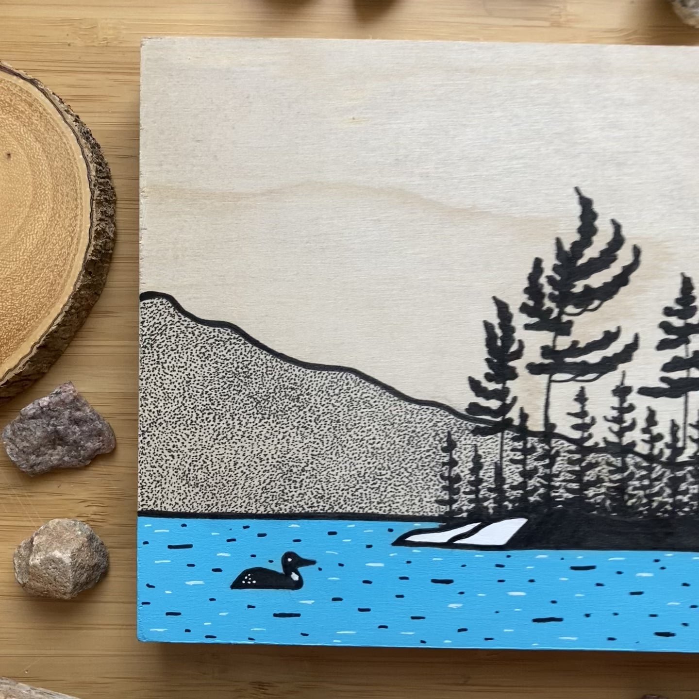 Created using archival ink pens and acrylic paint on a birch wood panel.