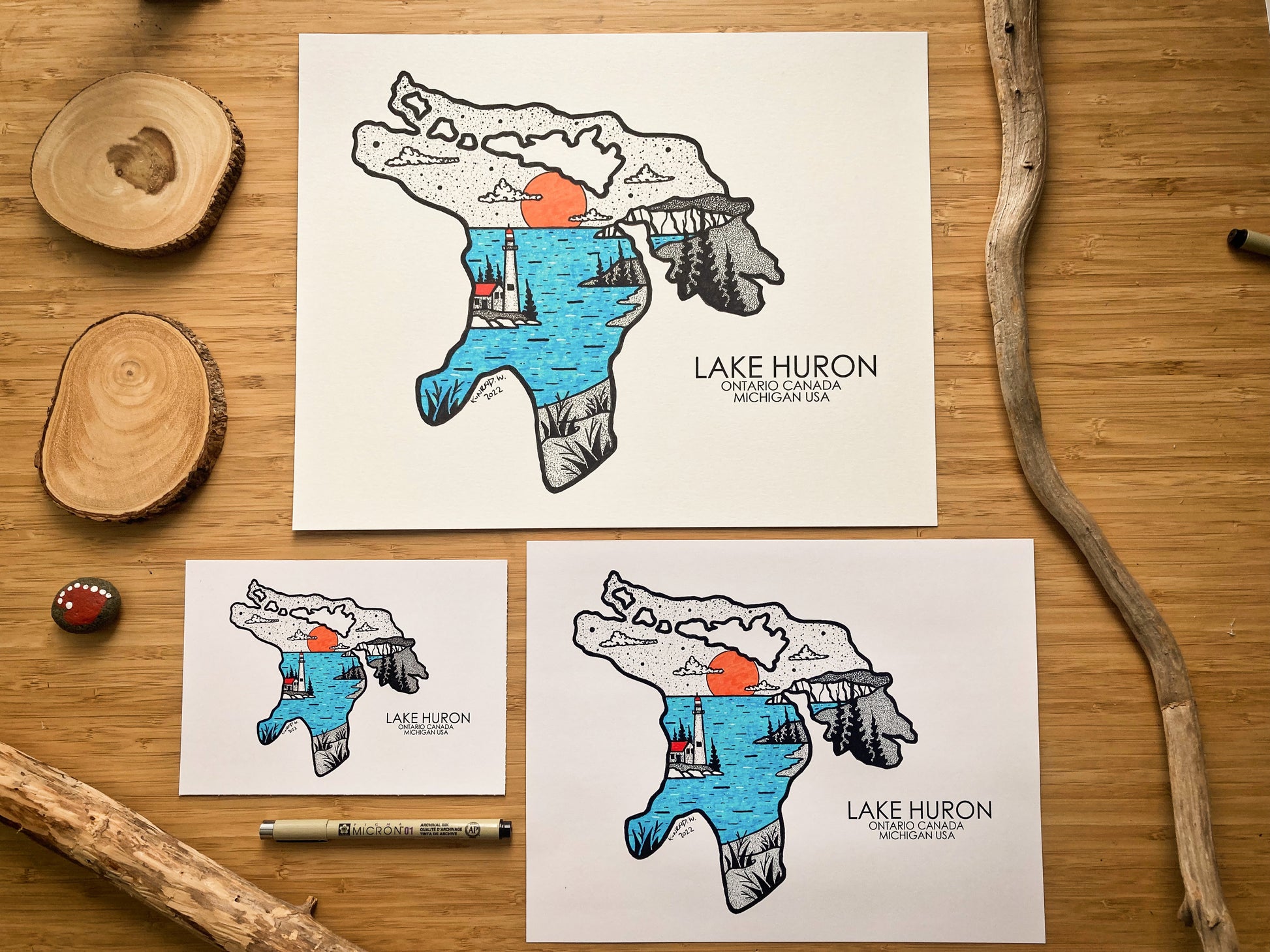 The design of these prints was created by hand using archival ink pens. Using various stippling and shading techniques, the ink gives this piece a more modern or bold design that goes well will virtually any decor style. These prints come in three different sizes offering you options that fit a multiple of different spaces, from your home, office or cottage.