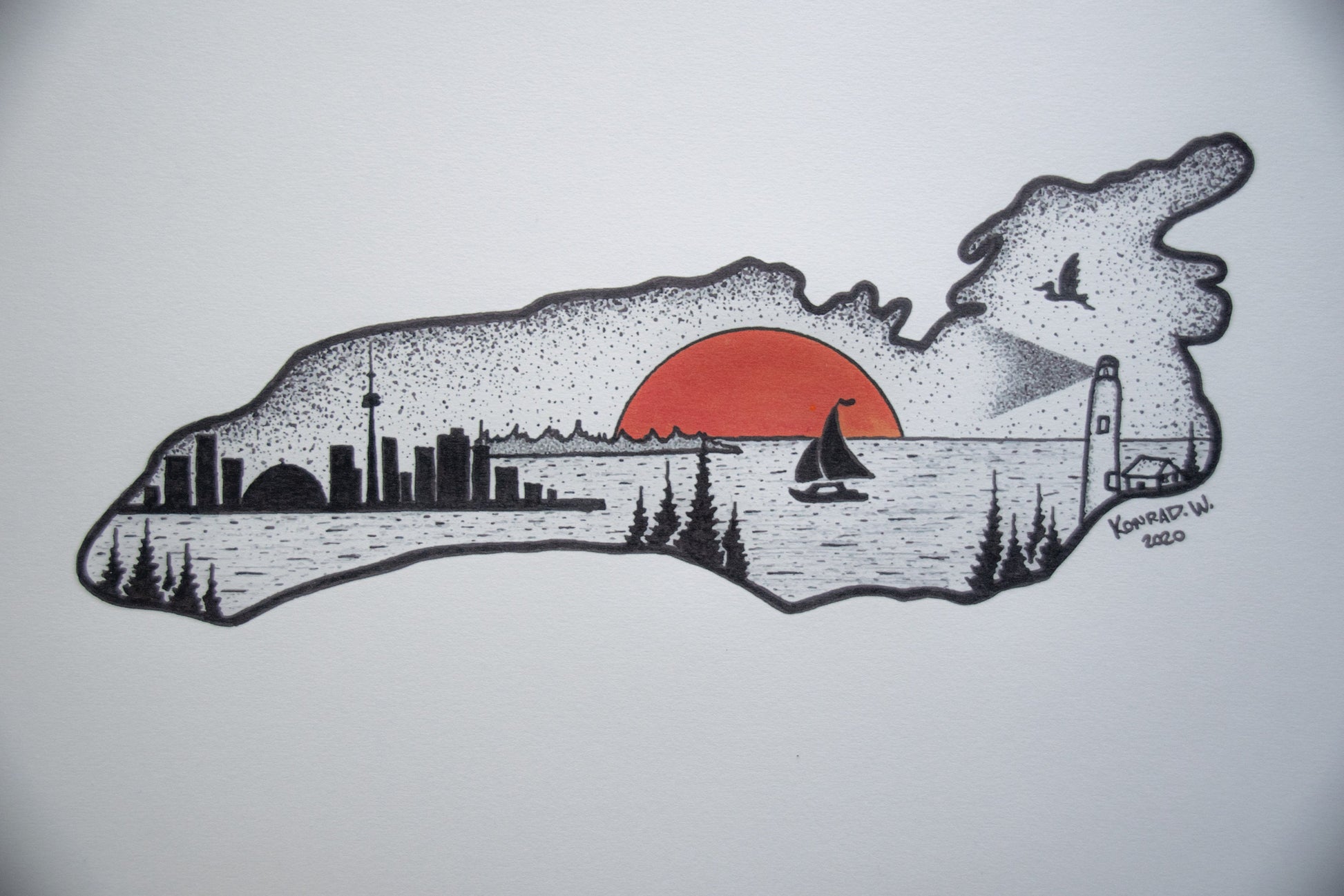 Lake Ontario might be the smallest of The Great Lakes, but is hugged by one of the greatest cities in Canada, Toronto. Its iconic skyline is featured in this unique Pen and Ink Print, along with a sail boat, flying heron and lighthouse - all prominent features of this beautiful lake.