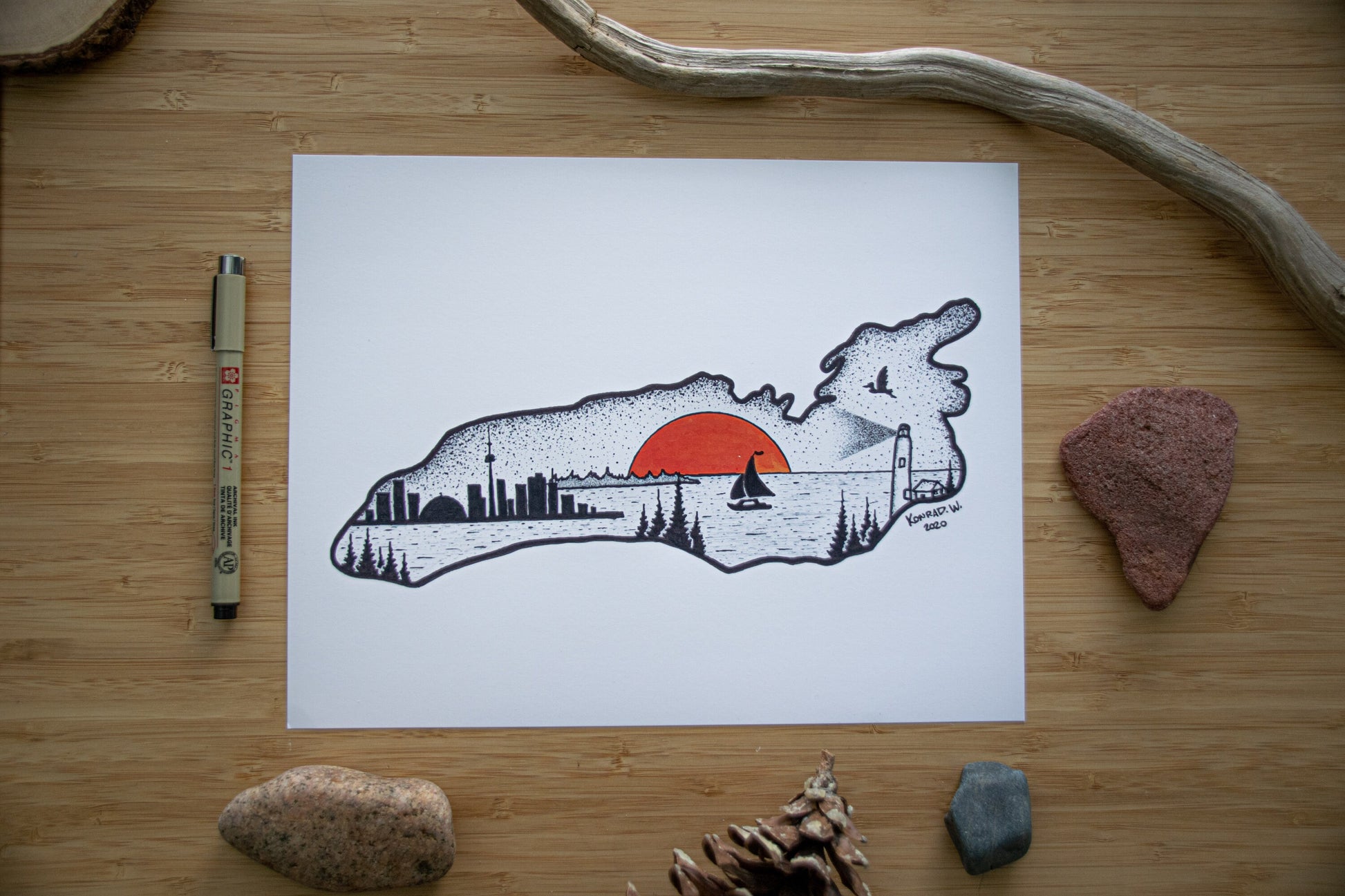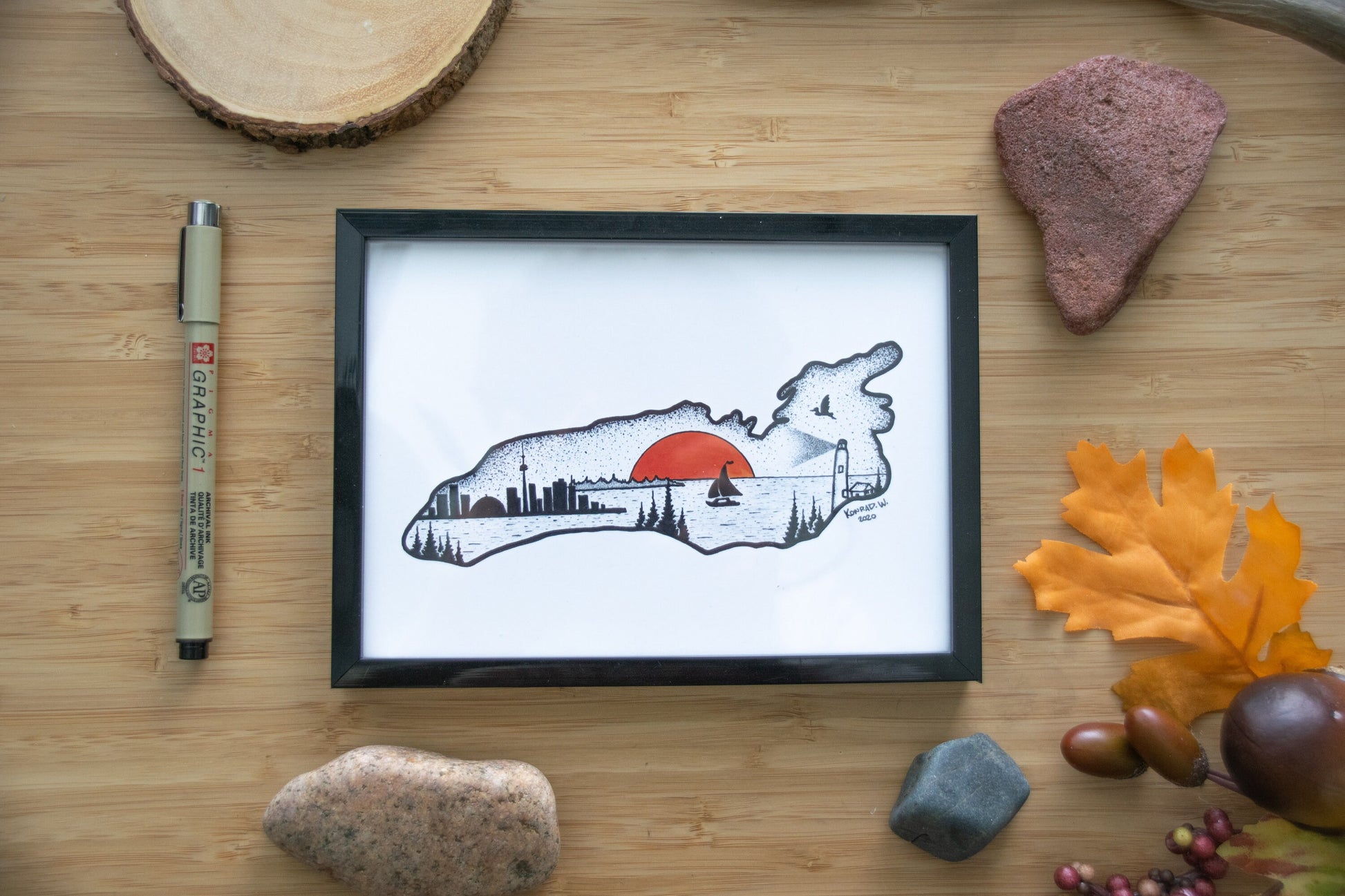 The design of these prints was created by hand using archival ink pens. Using various stippling and shading techniques, the ink gives this piece a more modern or bold design that goes well will virtually any decor style. These prints come in three different sizes offering you options that fit a multiple of different spaces, from your home, office or cottage.
