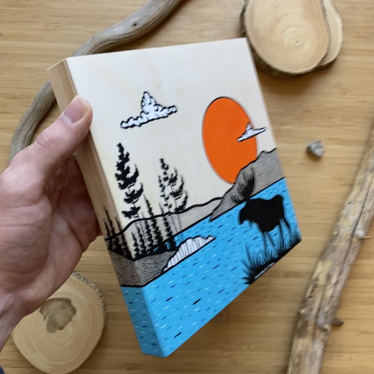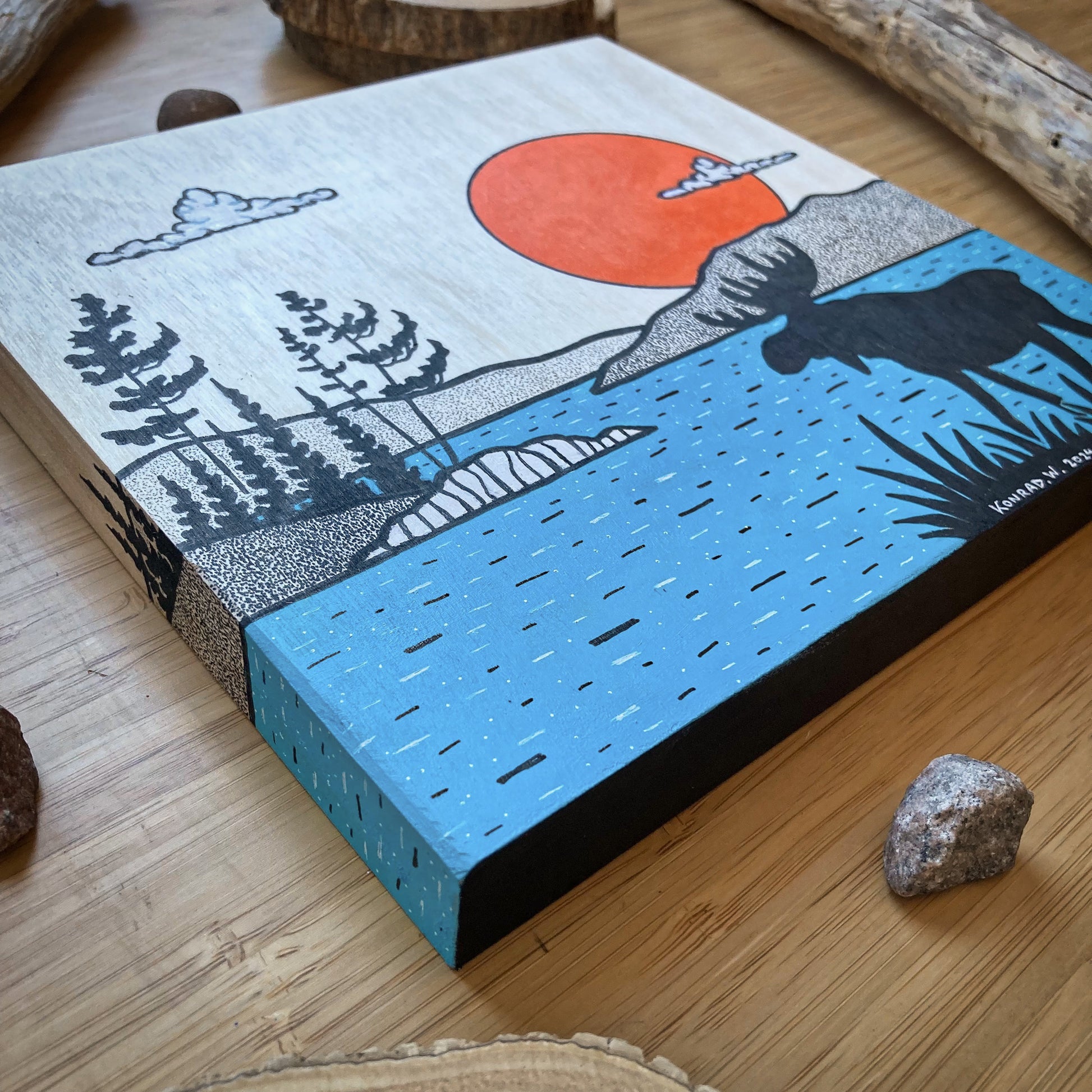 This Original 8x8 wood panel illustration features a silhouette of a moose surrounded by a lake scene