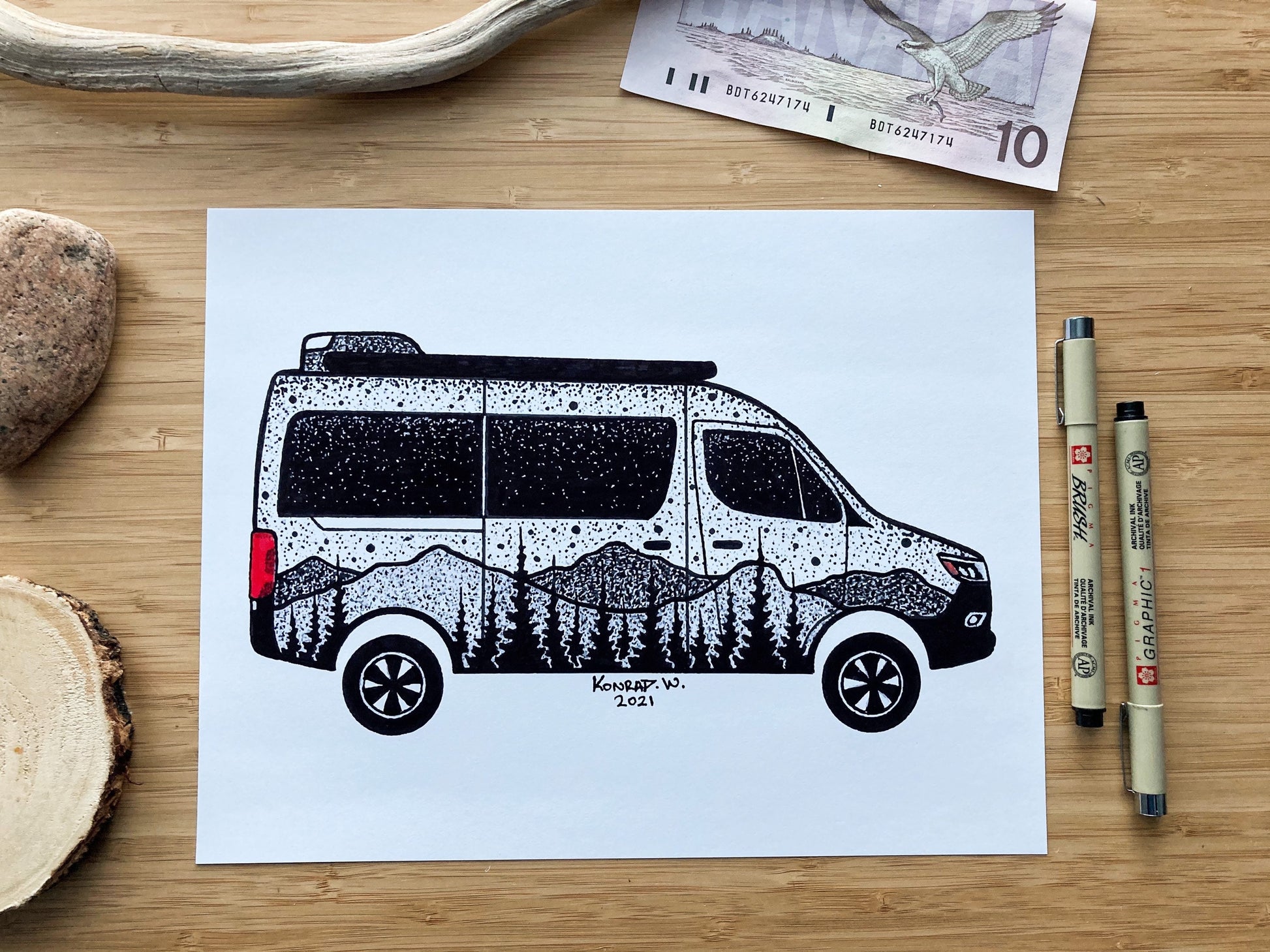 The Sprinter Camper Van Prints are made for those who lust for the open road and endless opportunities for adventures! Whether you're a weekend warrior or full time vanlifer, this Pen and Ink Print is perfect for you! The design of these prints was created by hand using archival ink pens. Using various stippling and shading techniques, the ink gives this piece a more modern or bold design that goes well will virtually any decor style. These prints come in three different sizes offering you options that fit a multiple of different spaces, from your home, office, cottage or even your van! Sizes include: 5x7" 8.5x11" 11x14" The artwork is printed in house with a premium inkjet printer on matte photo paper. Made to order. Allow 1 business day to process order. Packaged in a clear protective bag for shipping and mailed in a rigid envelope. **Frame pictured is not included** *Standard shipping for 5x7" and 8.5x11" does not come with a tracking number. Be sure to follow @naturally_illustrated on Instagram and @naturallyILLUSTRATEDofficial on Facebook for the latest updates and newest projects!