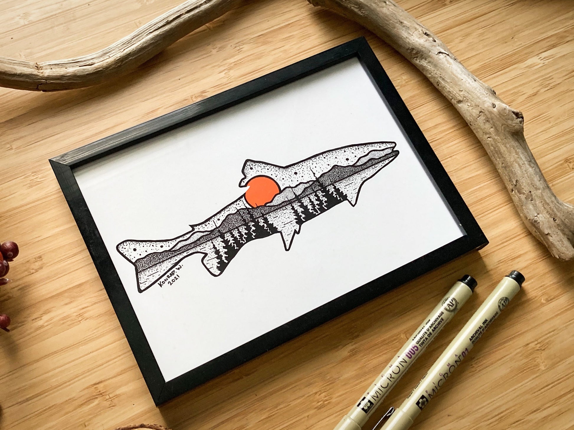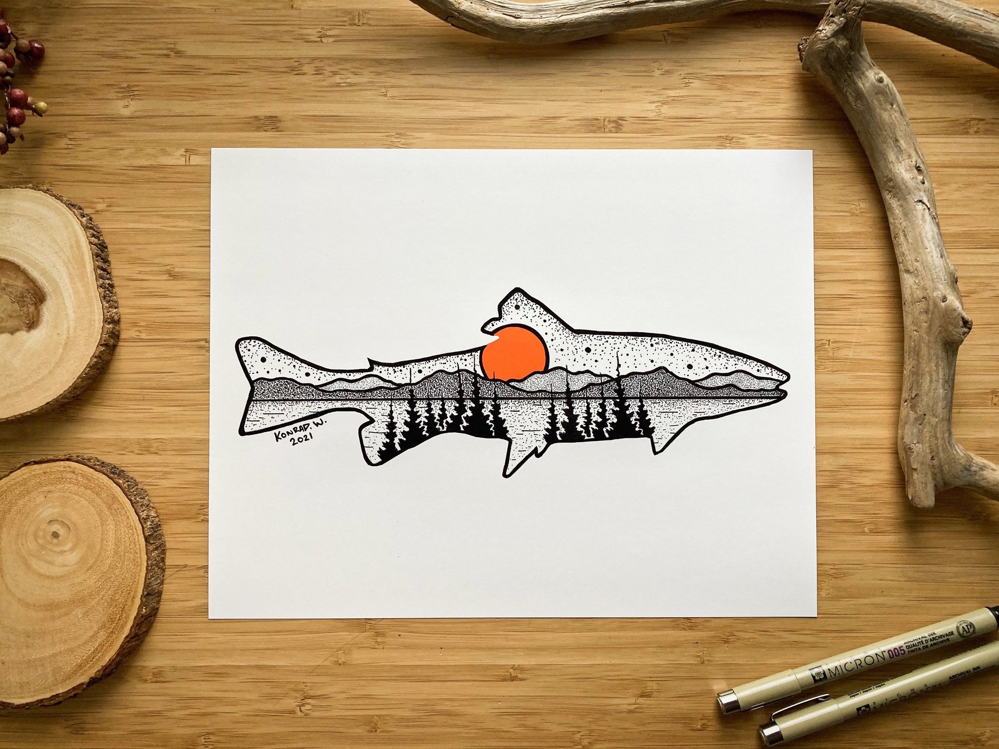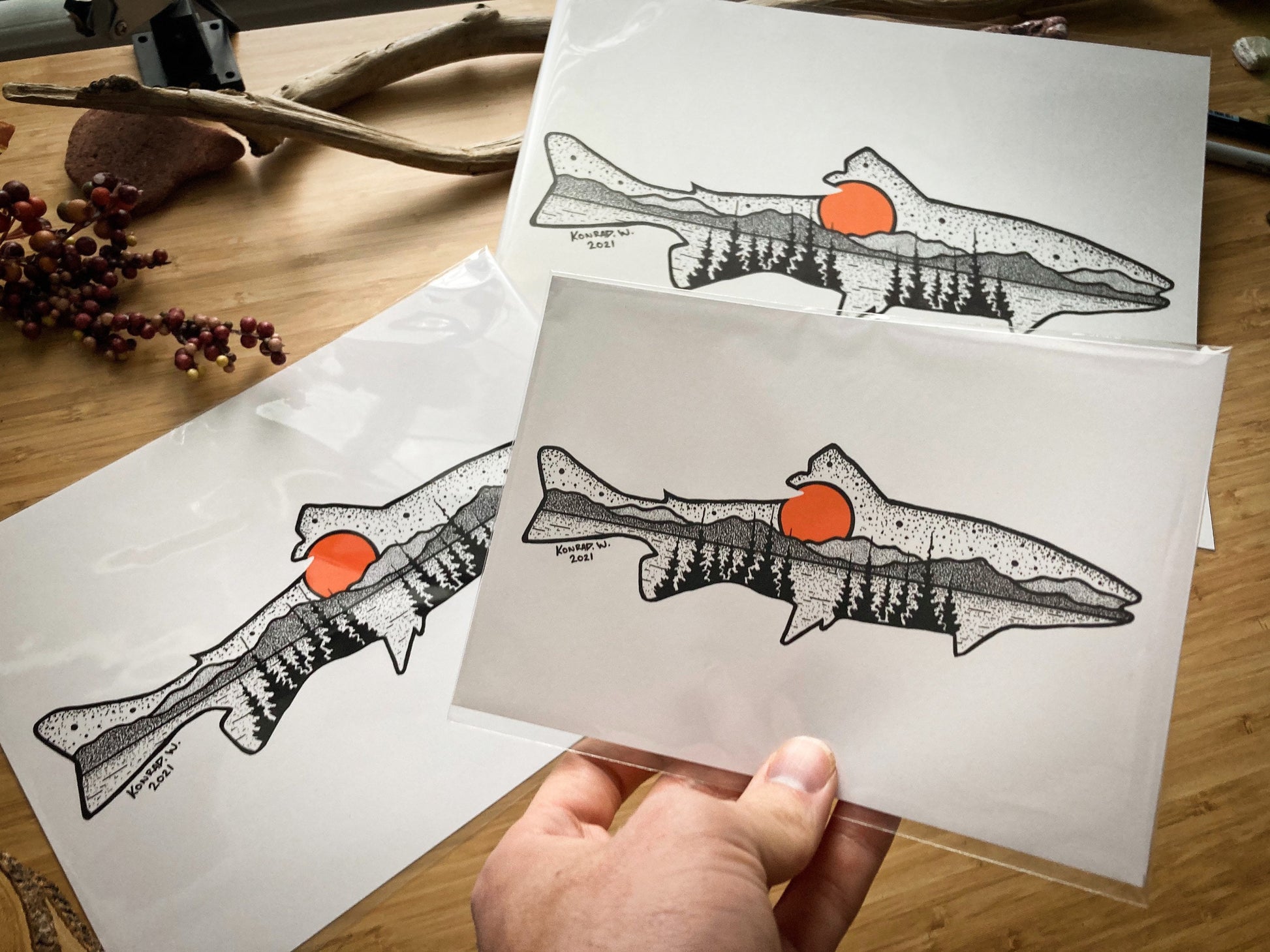 This Trout Silhouette Pen and Ink Print is perfect for those who rather be fishing than doing anything else! The design of these prints was created by hand using archival ink pens. Using various stippling and shading techniques, the ink gives this piece a more modern or bold design that goes well will virtually any decor style. These prints come in three different sizes offering you options that fit a multiple of different spaces, from your home, office or cottage. Sizes include: 5x7" 8.5x11" 11x14" The artwork is printed in house with a premium inkjet printer on matte photo paper (5x7" & 8.5x11") and high quality artist paper (11x14"). Please note that the largest print size will have a slightly off white background when compared directly beside the two smaller sizes due to the different type of paper. Made to order. Allow 1 business day to process order. Packaged in a Eco friendly, biodegradable clear protective bag for shipping and mailed in a rigid envelope. *Standard shipping for 5x7" and 8.5x11" does not come with a tracking number Be sure to follow @naturally_illustrated on Instagram and @naturallyILLUSTRATEDofficial on Facebook for the latest updates and newest projects!